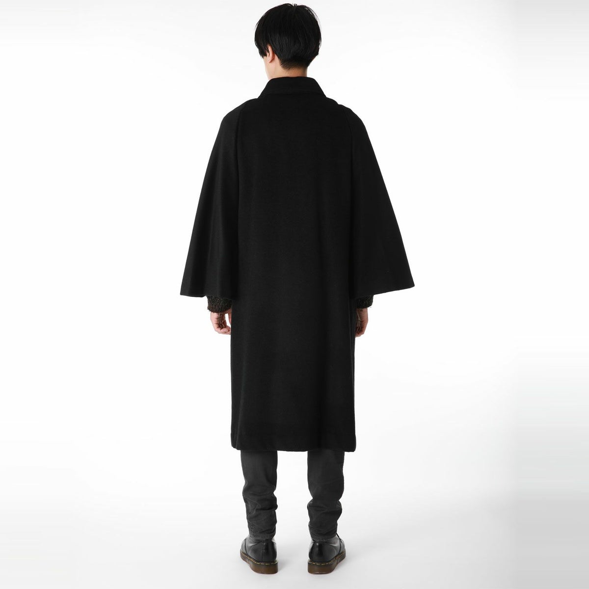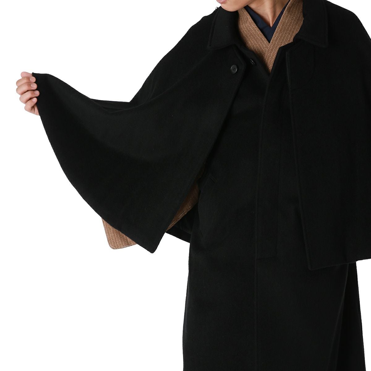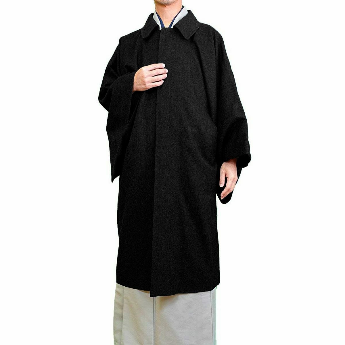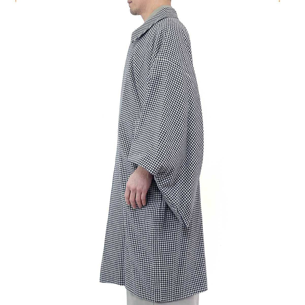 着物と同じ形状の袖が大きく開いており、着物を着用したまま袖をその中に入れることができるのが角袖コートです。ステンカラーのベーシックなデザインで、気軽な街歩きはもちろんフォーマルな着物の際にもご着用いただけます。