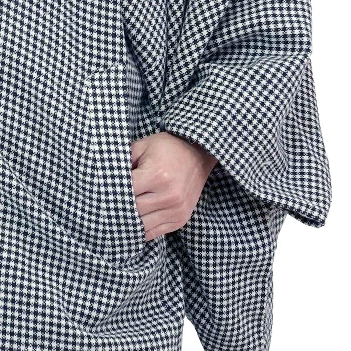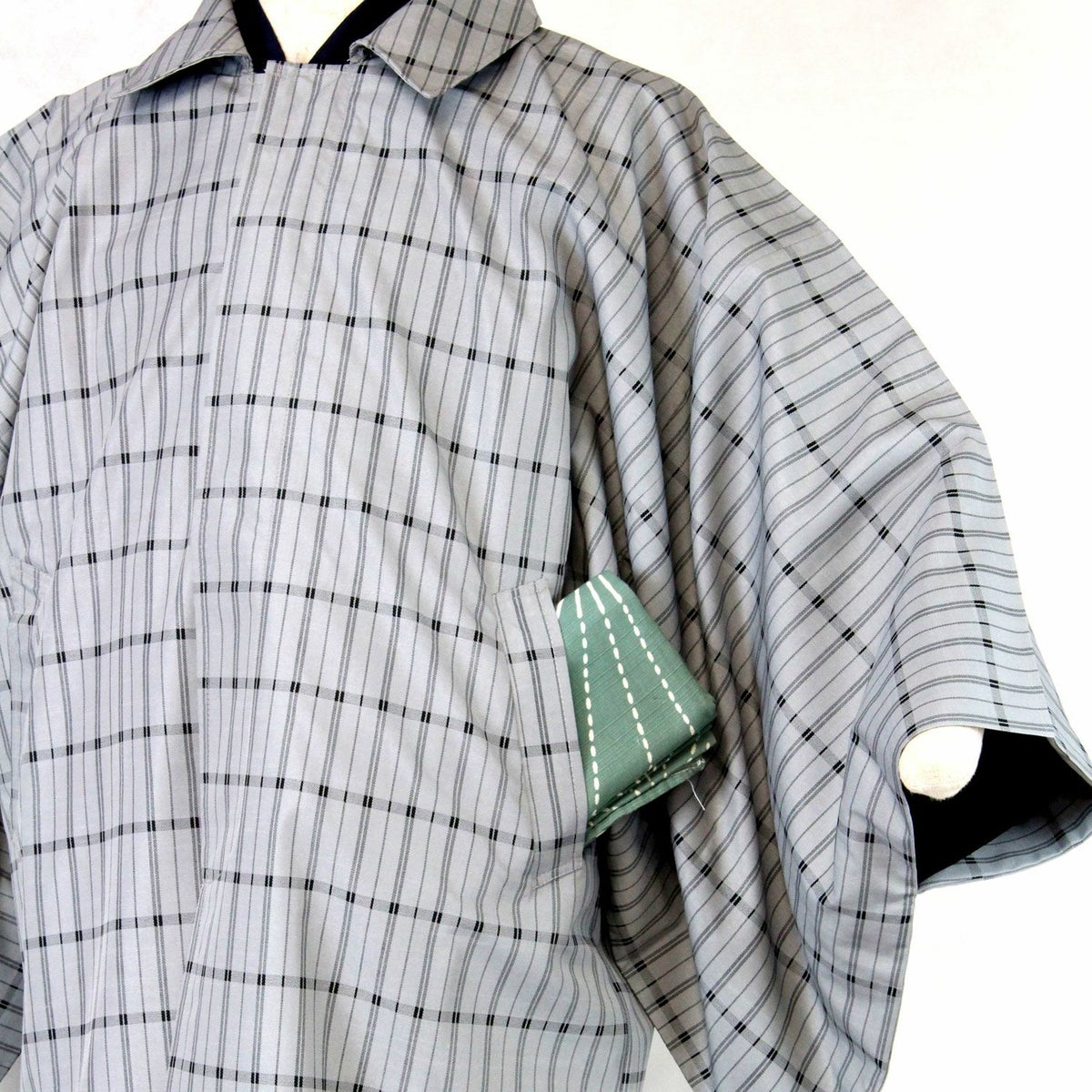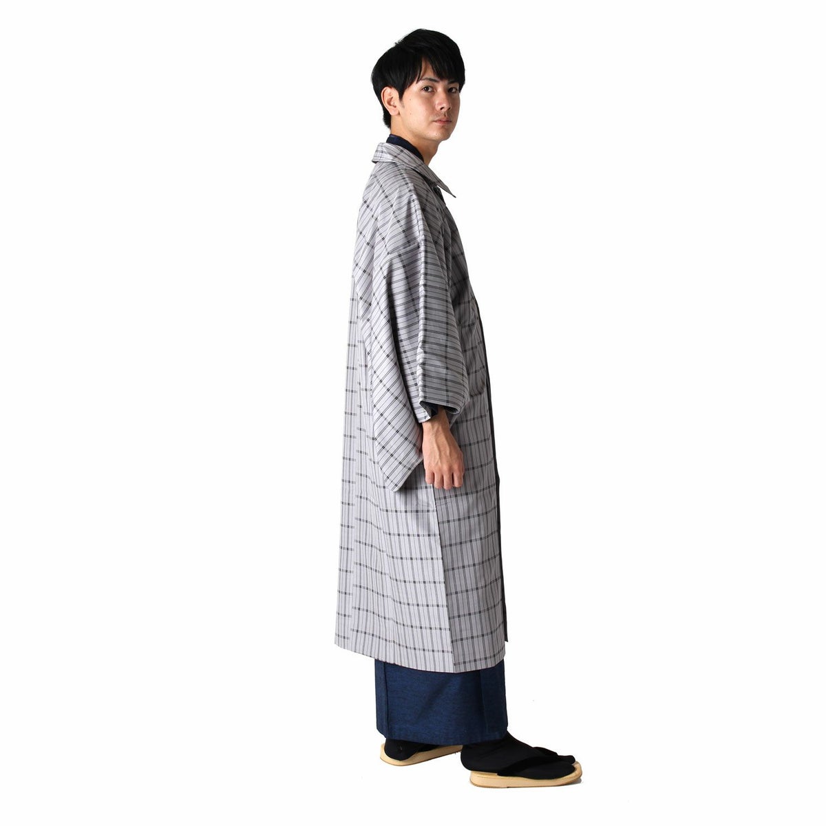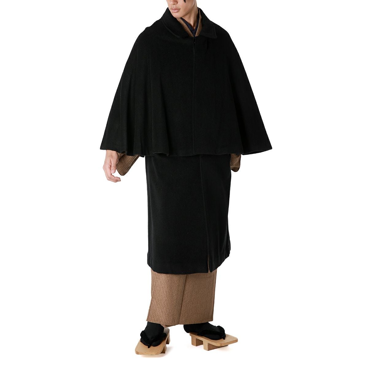 着物と同じ形状の袖が大きく開いており、着物を着用したまま袖をその中に入れることができるのが角袖コートです。ステンカラーのベーシックなデザインで、気軽な街歩きはもちろんフォーマルな着物の際にもご着用いただけます。