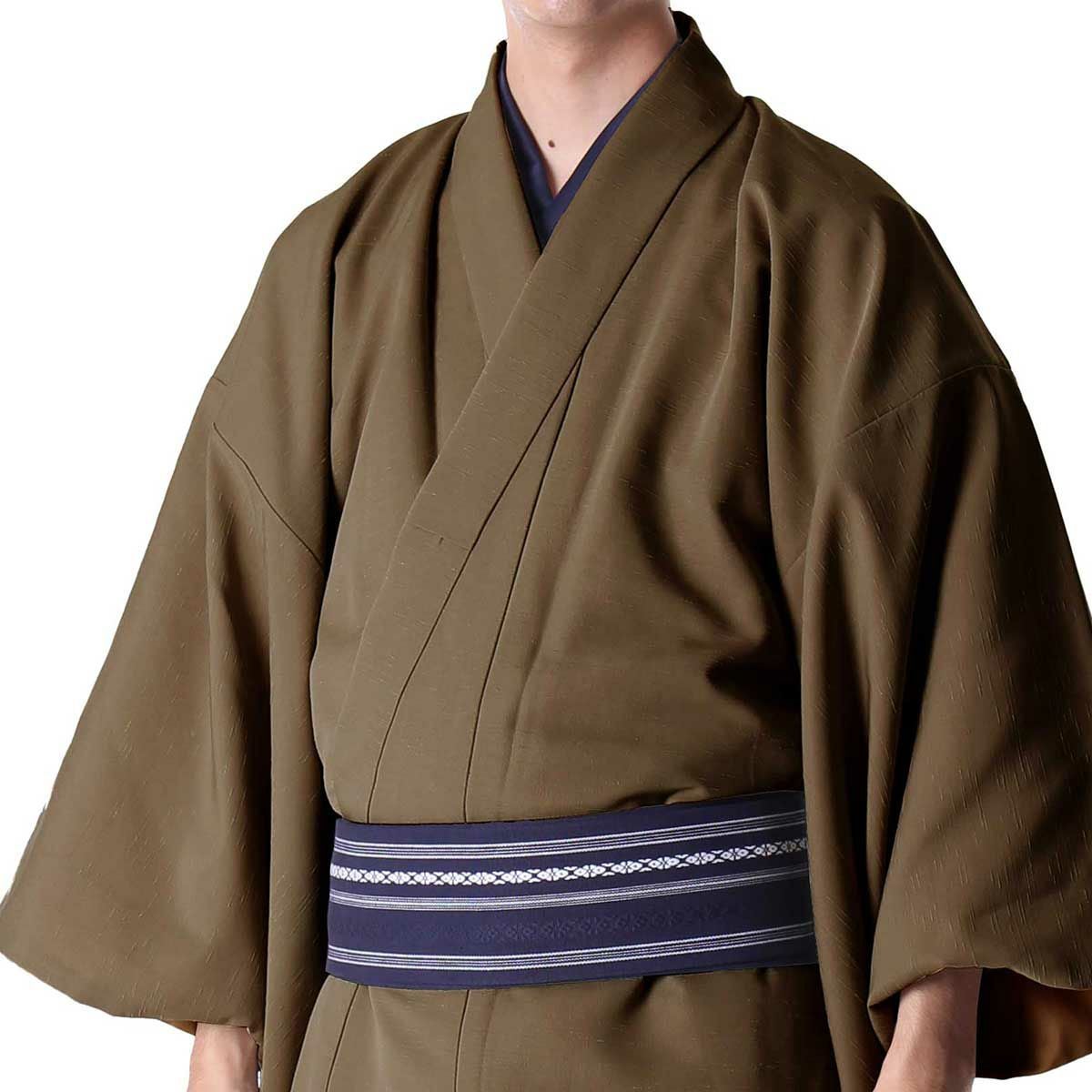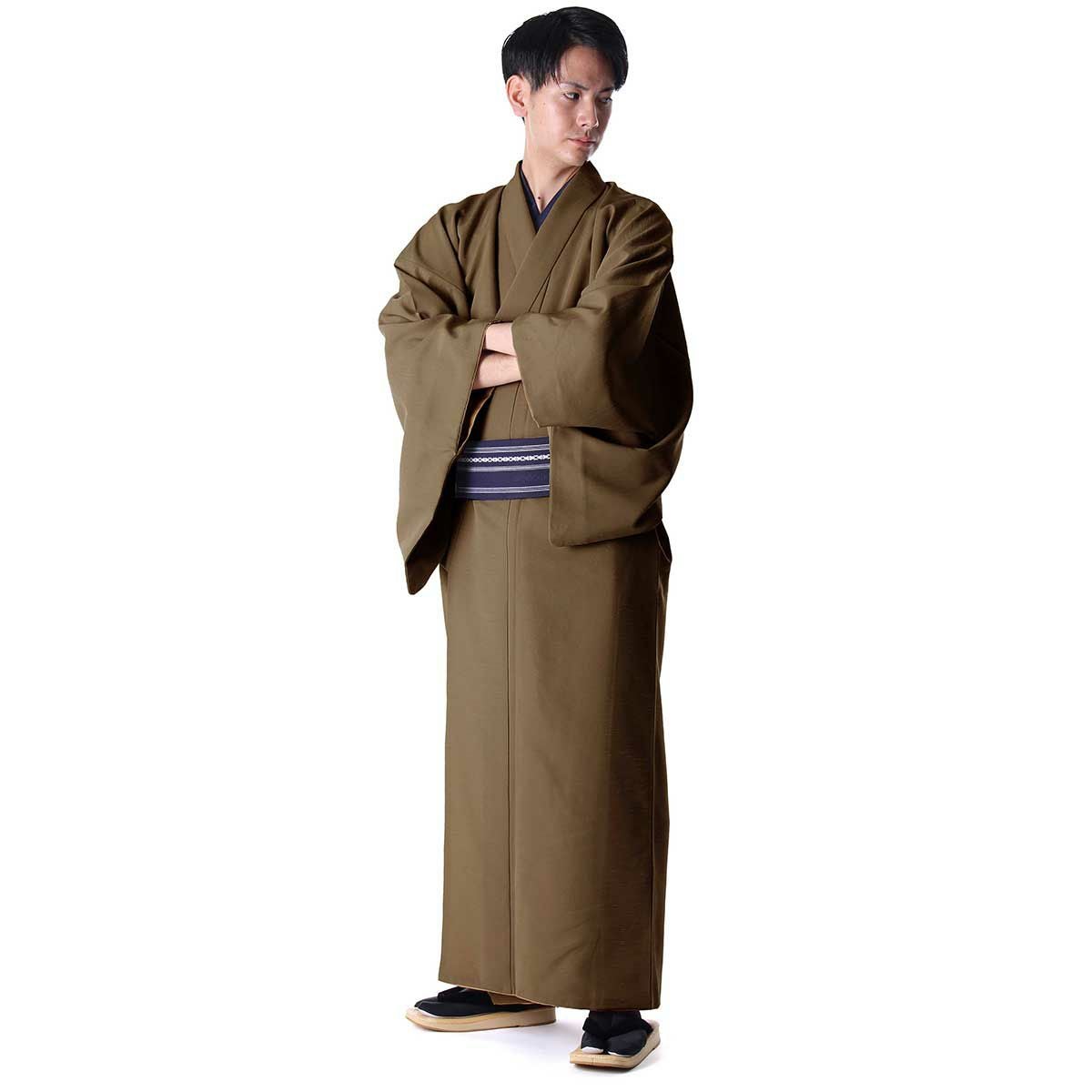 すぐに着られる動き易い男着物 洗える 紬 袷 鶯茶 175cm前後対応