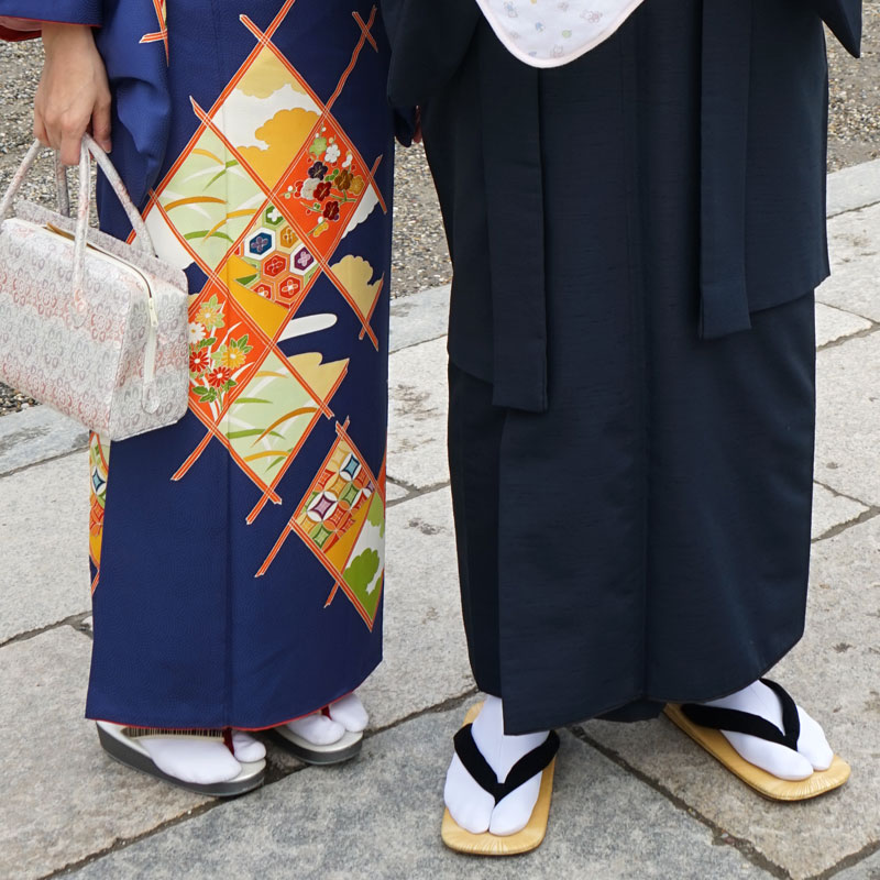 足袋は柄足袋や派手な色足袋は控えましょう。黒足袋はNGとまではなりませんが、七五三やお宮参りなど神聖な行事に参加する場合は、白足袋の方が礼装感が出ますので白足袋を推奨しております。