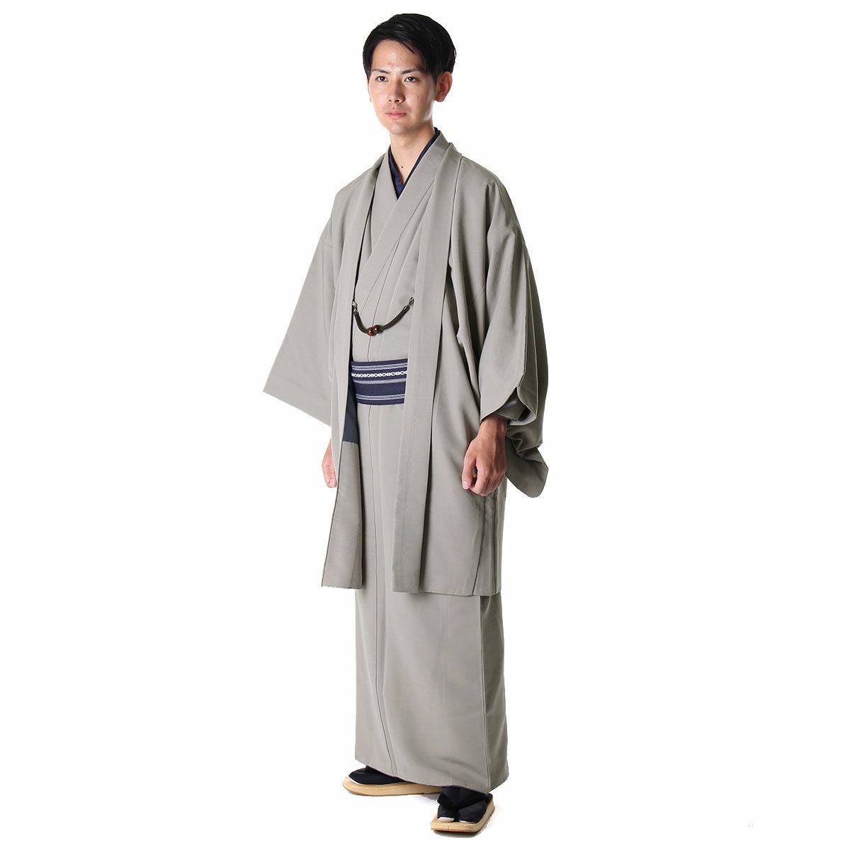 1)仕立て上がり着物(袷):ポリエステル100% 2)仕立て上がり羽織(袷):ポリエステル100% 3)仕立て上がり半襦袢:身頃:綿100% 袖と衿:ポリエステル100% 4)献上柄角帯:綿100% 5)雪駄:台部分はビニール皮、鼻緒部分はポリエステル 6)羽織紐:紐:絹100% 7)信玄袋:本体|綿85%、麻15% 8)黒足袋(M~LL):ストレッチ丸首足袋 表:ポリエステル100% 裏:綿100% ※大きいサイズは4枚こはぜの綿100% 9)男締め:ゴム40% ポリエステル30% レーヨン30% 10)腰紐:ポリエステル100%