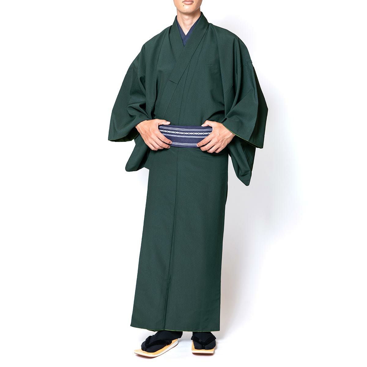 大きいサイズ!茶道やセミフォーマルなシーンに!お手頃価格で揃う 男着物10点フルセット 洗える着物 ちりめん 深緑 3L(春・秋・冬)