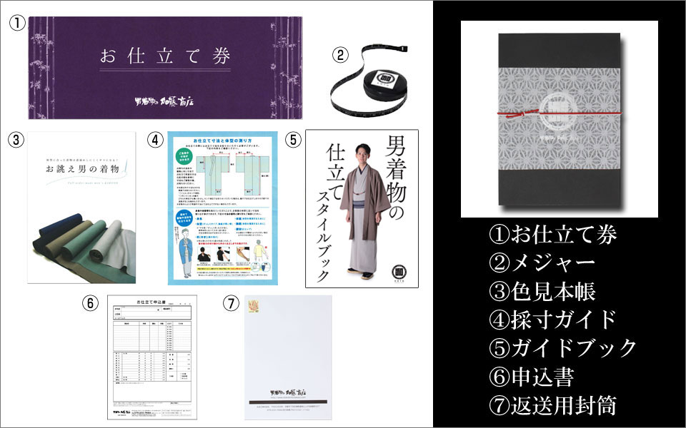 お届け商品 ①お仕立て券 ②メジャー ③色見本帳 ④採寸ガイド ⑤ガイドブック ⑥申込書 ⑦返送用封筒