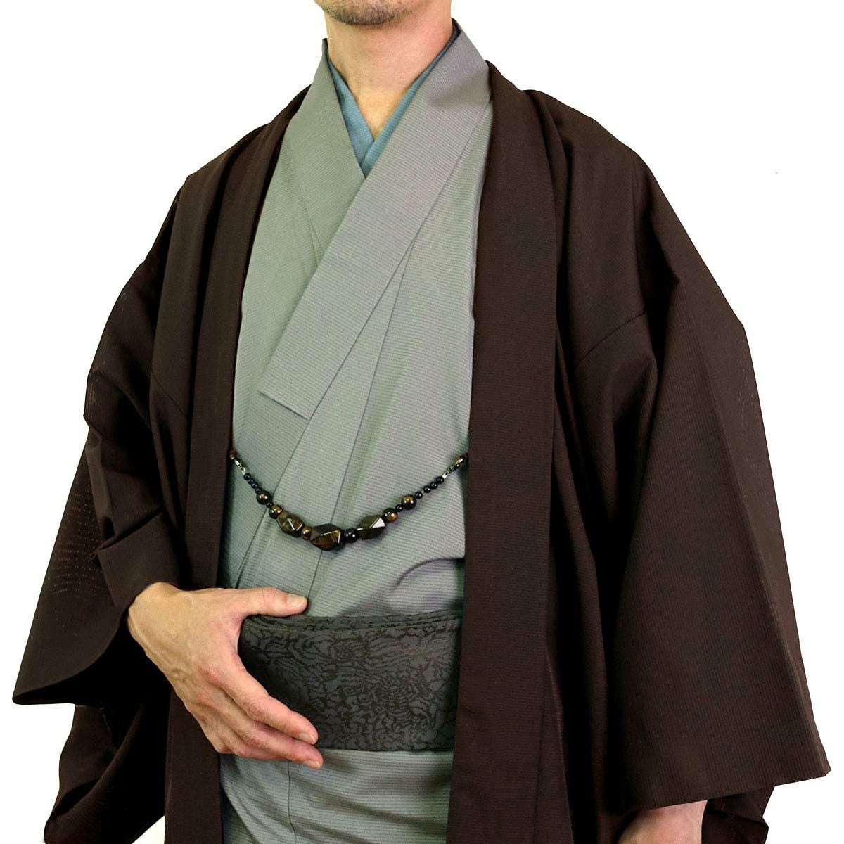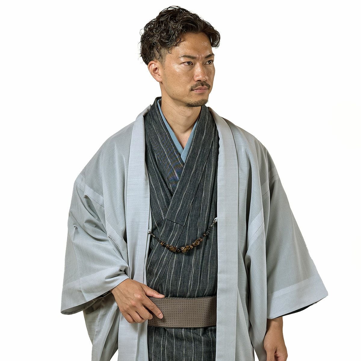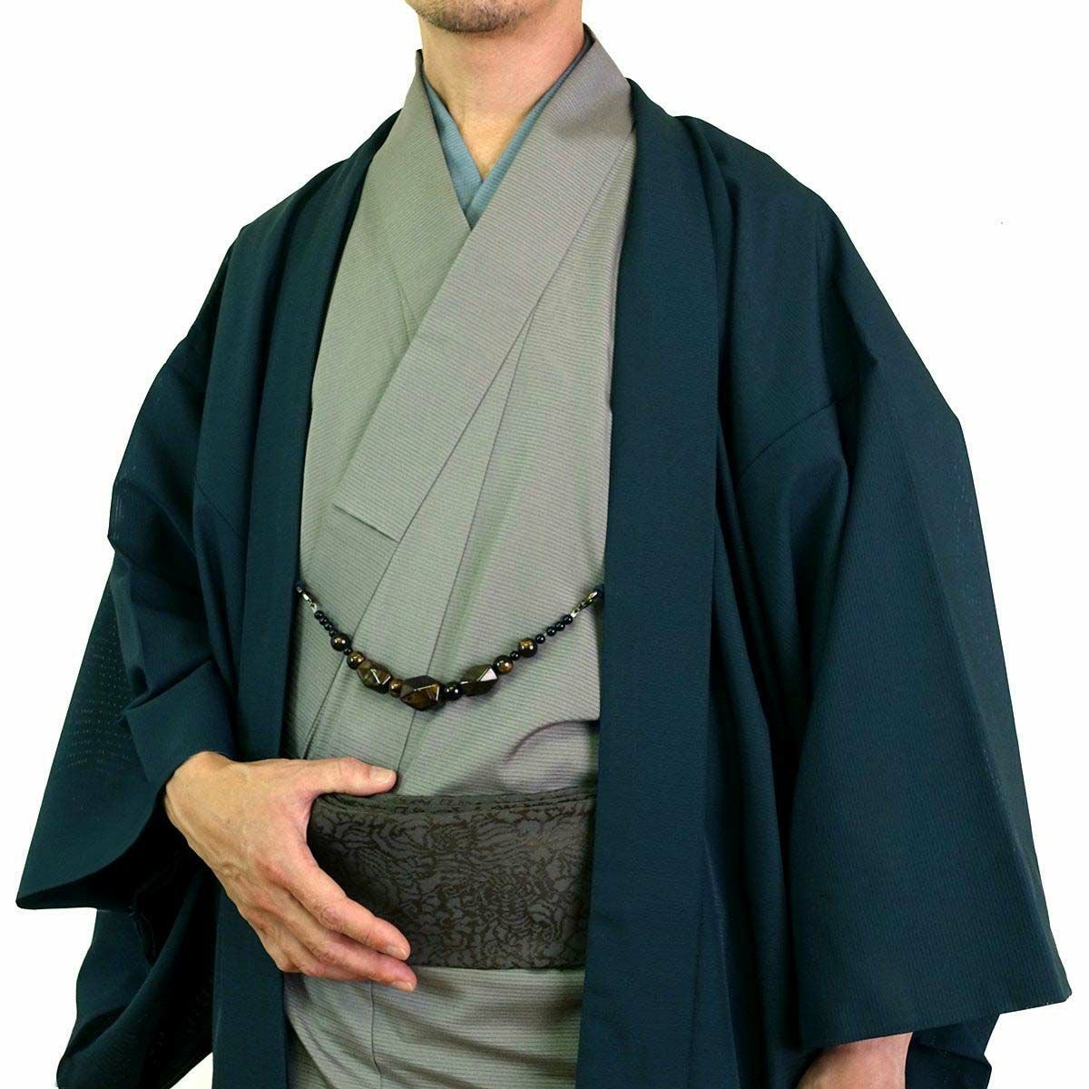 男性着物の羽織は寒い日の防寒着だけでなくスーツでいうとジャケットにあたりますので、お祝いの席など改まった場面で”きちんと感”を出す事ができて、着物や小物等の色々な組合せによってシーンに合わせたコーディネートを楽しむことができます。また羽織の長さは基本的に膝前後位が立ち振る舞いがキレイに見えます。