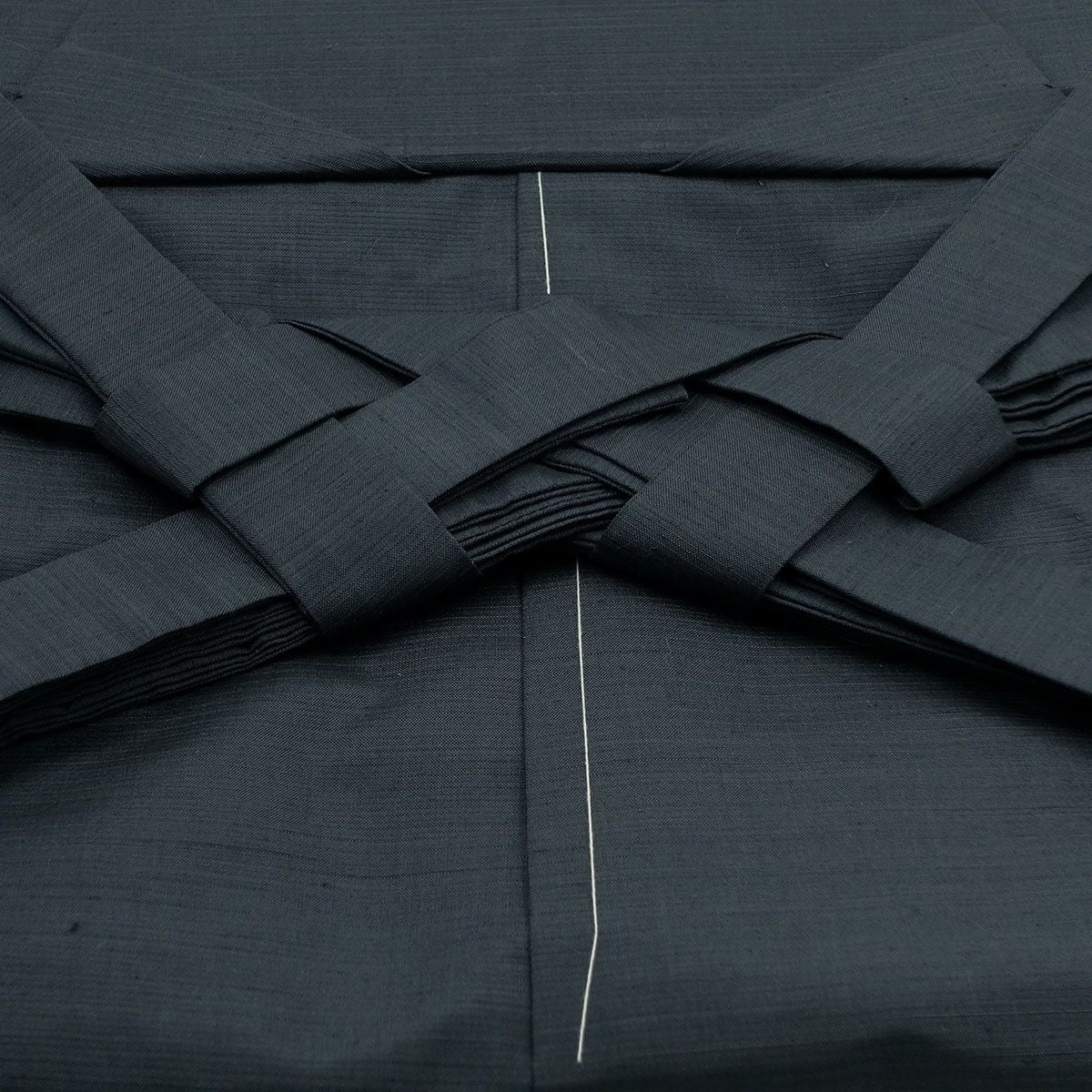 一般的に袴の生地は硬く型崩れしにくい素材のものが多いですが、こちらの袴は通常の袴生地よりも薄手の素材となっています。その為、茶道などで座った状態から立ち上がっても広がった形から通常の形状に戻りやすい特長があります。主に茶道や式典や冠婚葬祭など各種儀礼や改まった席に出席する際に穿ける仕立て上がりの正絹馬乗り袴です。裾さばきしやすく歩きやすく美しい光沢とシワになりにくく、しなやかで丈夫なので重宝されます。