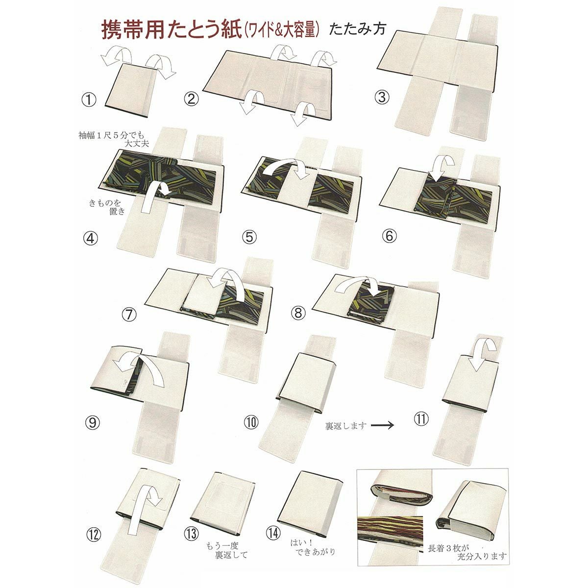着物3枚や着物と羽織、長襦袢等のセットも楽々収納することが出来ます。通常の携帯たとう紙よりも幅の大きいワイドサイズなので裄巾の大きい男性着物にも対応してるので男女兼用でお使い頂けます。