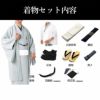 1)仕立て上がり紗の着物(単衣):ポリエステル100% 2)仕立て上がり紗の羽織(単衣):ポリエステル100% 3)仕立て上がり駒絽・長襦袢:ポリエステル100%(色は当店お任せ) 4)博多織正絹角帯:正絹:100% 5)雪駄 台部分はビニール皮、鼻緒部分はポリエステル 6)羽織紐:紐:絹100%(色は当店お任せ) 7)信玄袋:本体|綿85%、麻15%(色柄は当店お任せ) 8)黒足袋(M~LL):ストレッチ丸首足袋 表:ポリエステル100% 裏:綿100% ※大きいサイズは4枚こはぜの綿100% 9)男締め:ゴム40% ポリエステル30% レーヨン30% 10)腰紐:ポリエステル100%