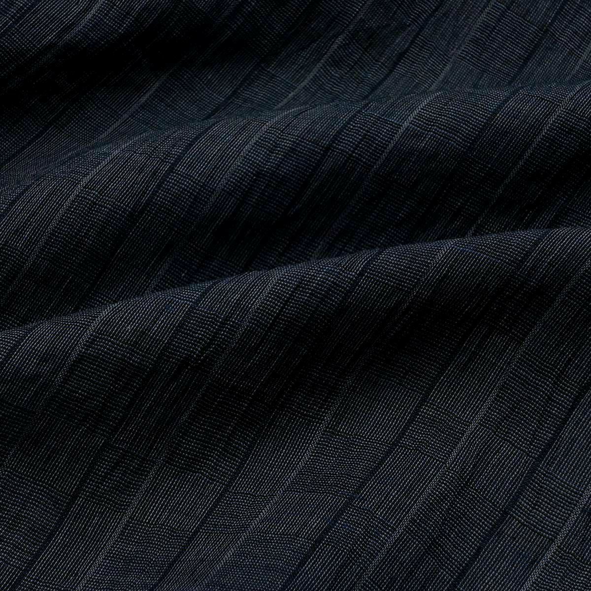 苧麻(カラムシ)と呼ばれる上質な麻糸を使用し、400年の伝統ある技術によって織り上げられた強撚糸使いの織物を昔ながらの技法”しぼとり板”と呼ばれる板の上で手作業によって揉み出される”手シボ”と新しい技術を組み合わせた加工法によって作り出された”手しぼ”加工です。手もみによる加工が麻の硬さを和らげシャリ感と程よい肌触りが得られます。肌にベとつかず、汗を吸っても乾燥が早く、見た目にも涼しげな印象を与えてくれる上質生地です。