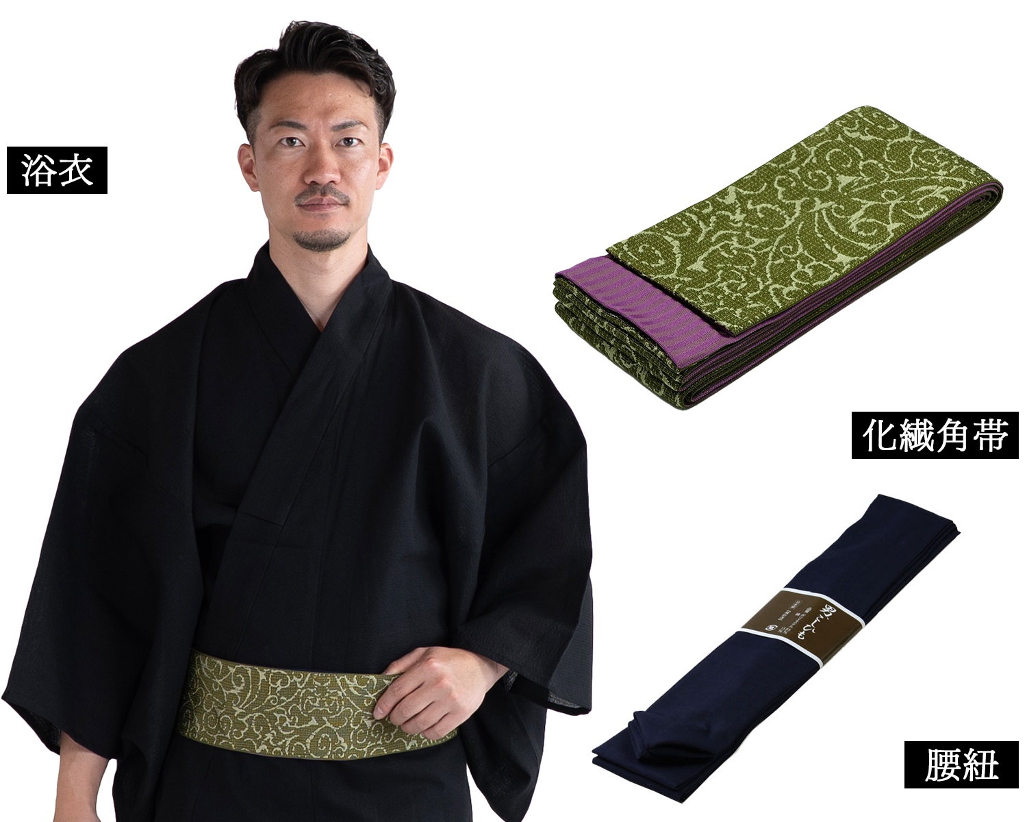 大きいサイズの浴衣セット しじら 綿麻 黒 3L~5L (浴衣+蔓カーキ角帯+腰紐)