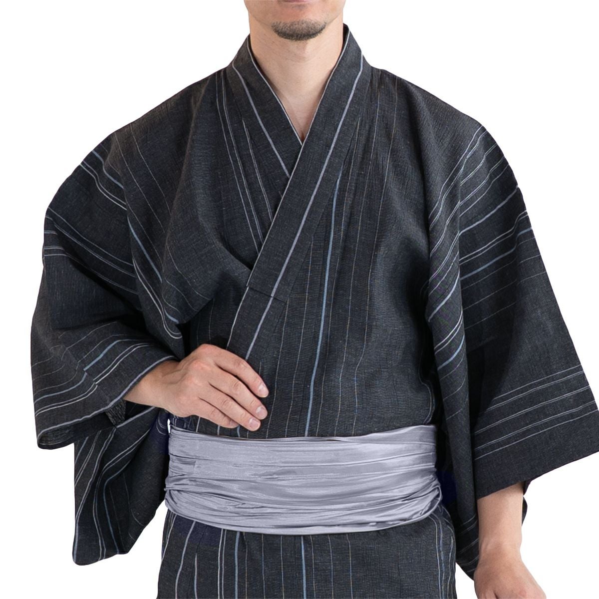 帯結びが苦手な方に!自由に結べる大人浴衣セット 近江ちぢみ 綿麻 縞 濃グレー 165cm~185cm前後対応 M~LL (浴衣+兵児帯+男締め)