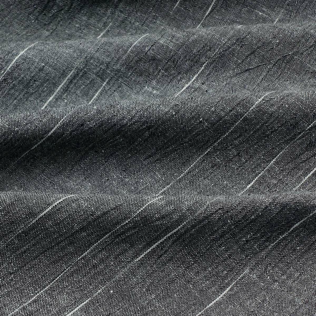 苧麻(カラムシ)と呼ばれる上質な麻糸を使用し、400年の伝統ある技術によって織り上げられた強撚糸使いの織物を昔ながらの技法”しぼとり板”と呼ばれる板の上で手作業によって揉み出される”手シボ”と新しい技術を組み合わせた加工法によって作り出された”手しぼ”加工です。手もみによる加工が麻の硬さを和らげシャリ感と程よい肌触りが得られます。肌にベとつかず、汗を吸っても乾燥が早く、見た目にも涼しげな印象を与えてくれる上質生地です。