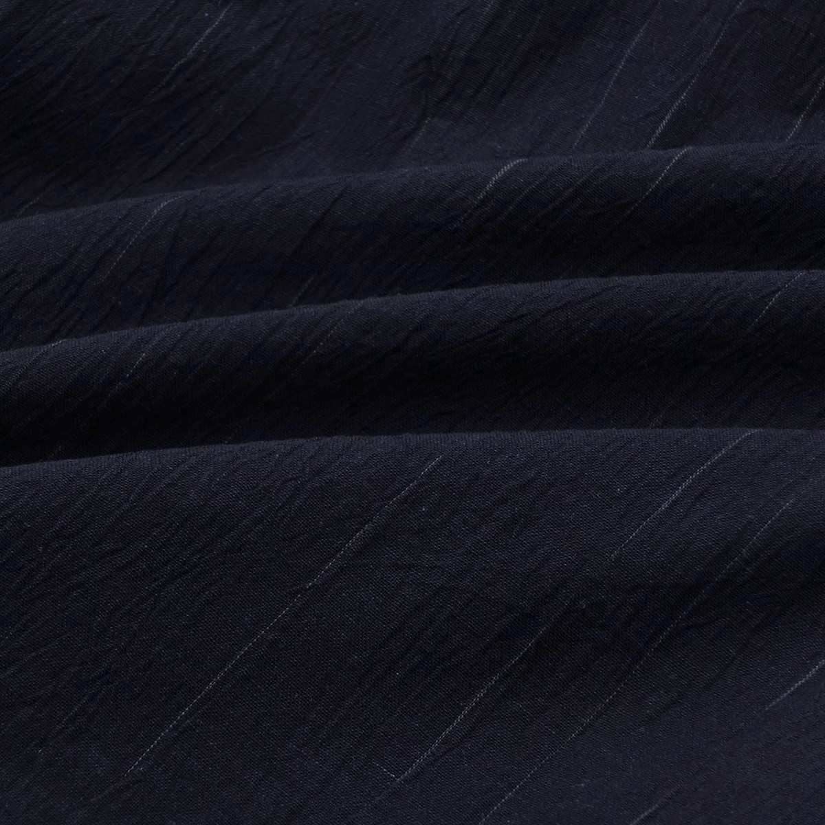 苧麻(カラムシ)と呼ばれる上質な麻糸を使用し、400年の伝統ある技術によって織り上げられた強撚糸使いの織物を昔ながらの技法”しぼとり板”と呼ばれる板の上で手作業によって揉み出される”手シボ”と新しい技術を組み合わせた加工法によって作り出された”手しぼ”加工です。手もみによる加工が麻の硬さを和らげシャリ感と程よい肌触りが得られます。肌にベとつかず、汗を吸っても乾燥が早く、見た目にも涼しげな印象を与えてくれる上質生地です。