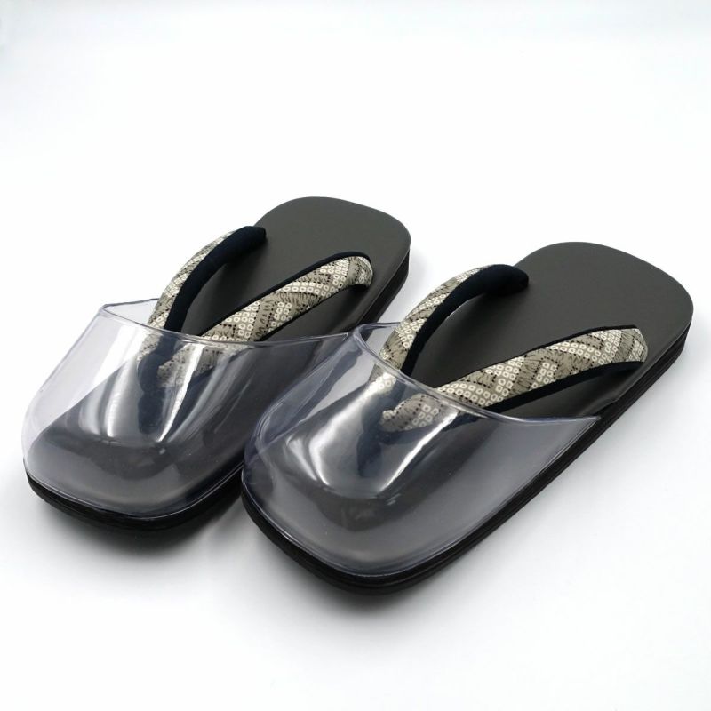 爪先部分に透明のカバーが付いた雨草履です。塵除け、雨天時だけでなく防寒としても重宝する履物です。ウレタン底なので雨の日でも滑りにくく、水が浸み込むこともありません。
