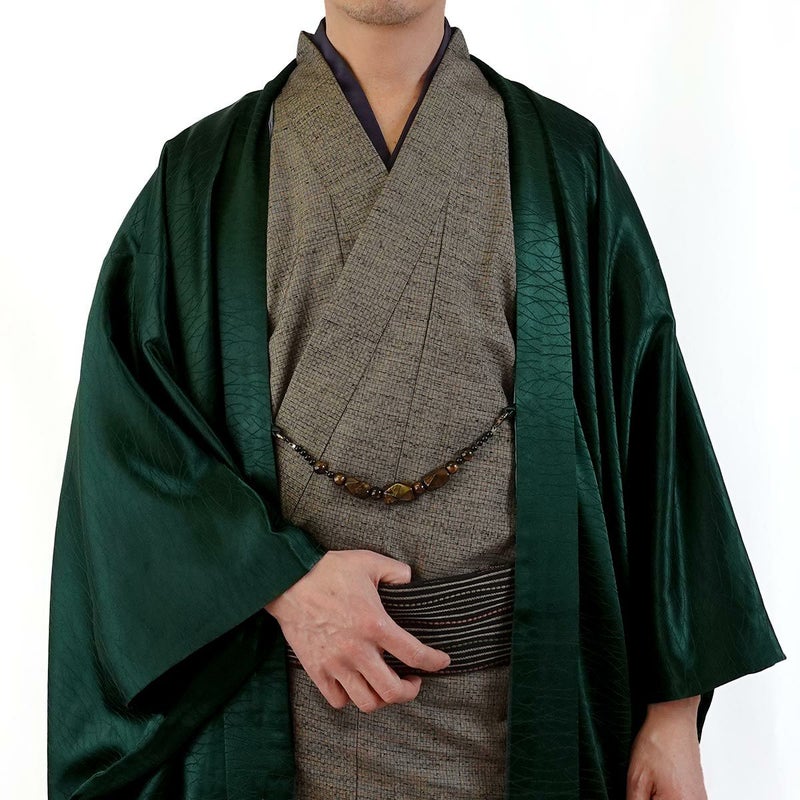 美しく高級感のある正絹特有の艶感のある男の羽織です。紋意匠の生地を使用しているので、独特のデザイン性も特長です