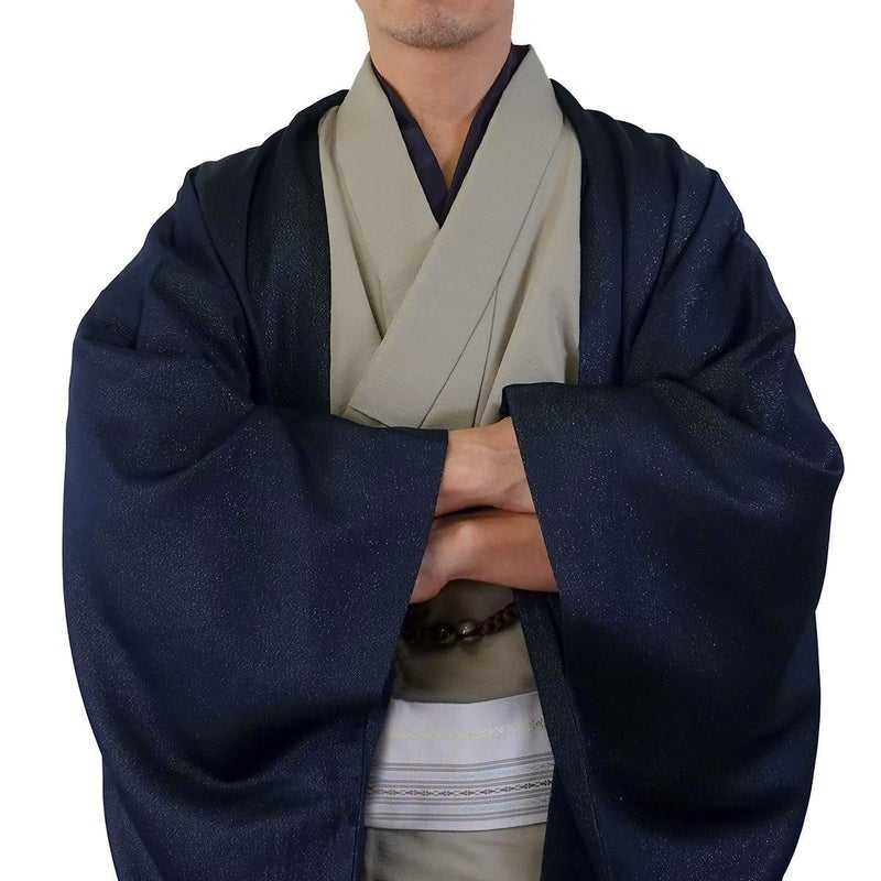 美しく高級感のある正絹特有の艶感のある男の羽織です。紋意匠の生地を使用しているので、独特のデザイン性も特長です