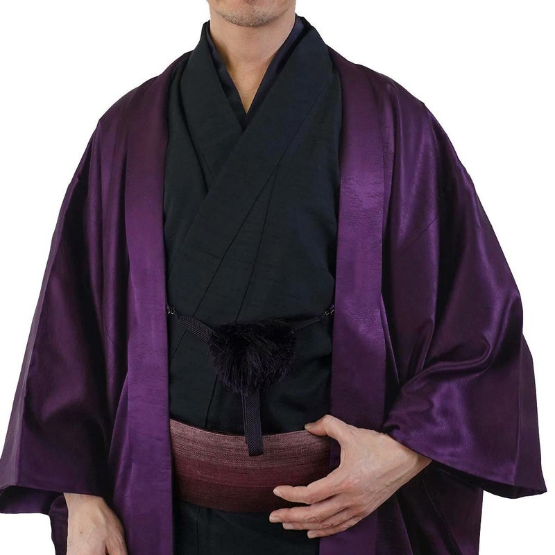 美しく高級感のある正絹特有の艶感のある男の羽織です。紋意匠の生地を使用しているので、独特のデザイン性も特長です