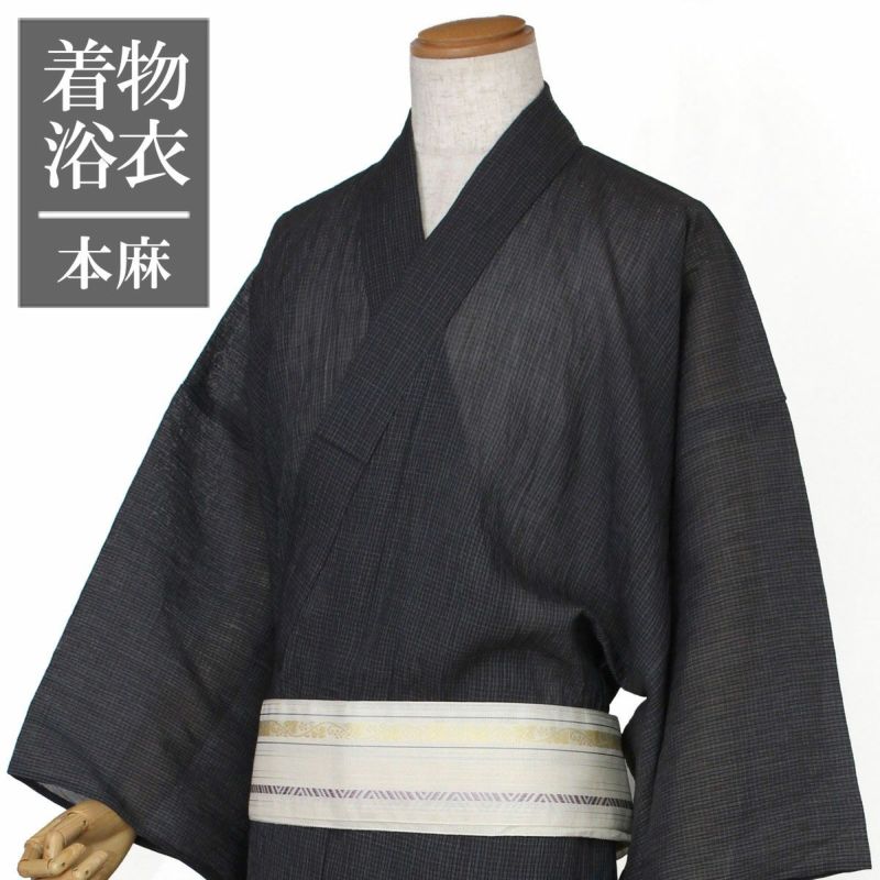 男着物 メンズ浴衣 夏着物 小千谷縮 本麻 黒 (7599)