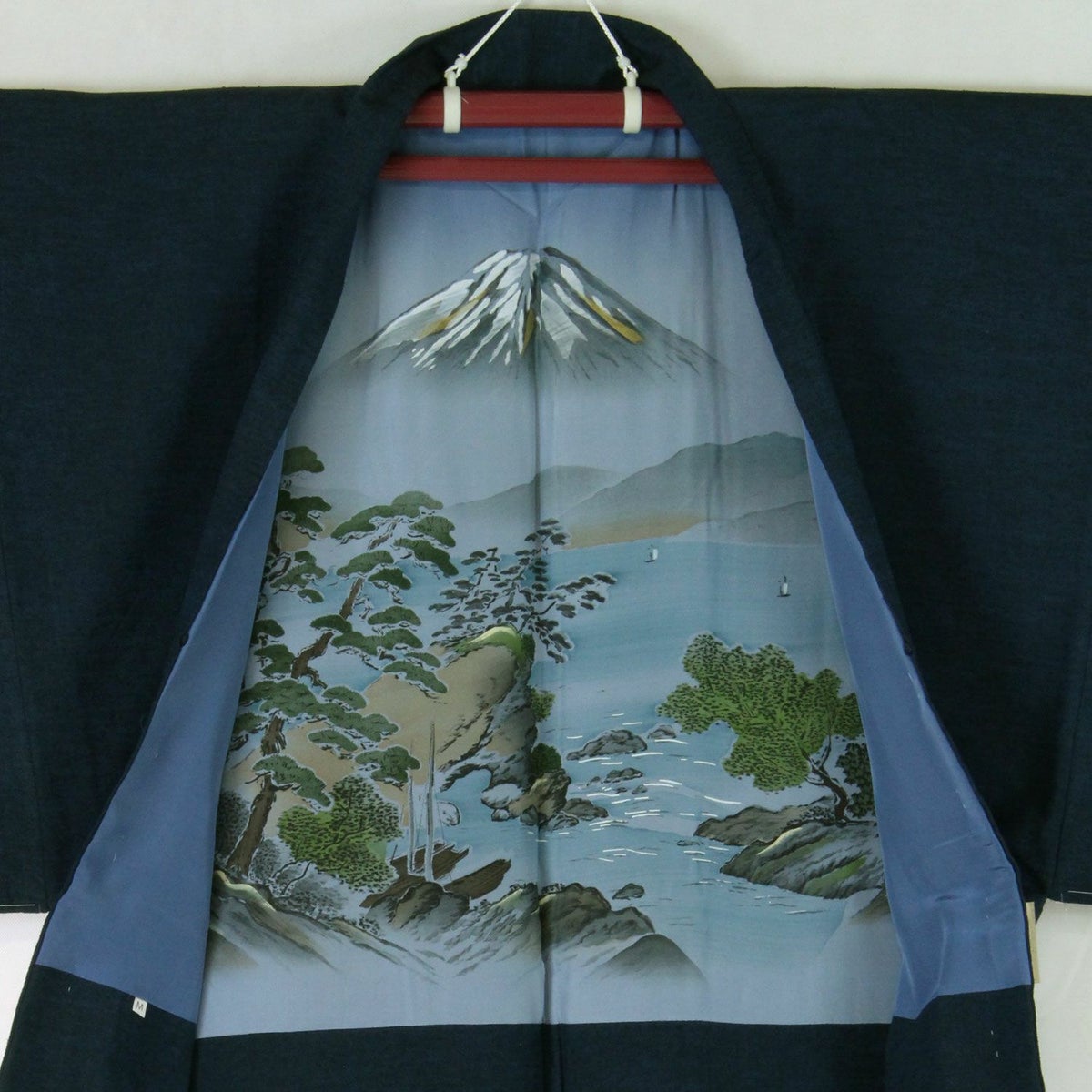 男羽織 洗える 袷 紬無地 鉄紺 龍 単品