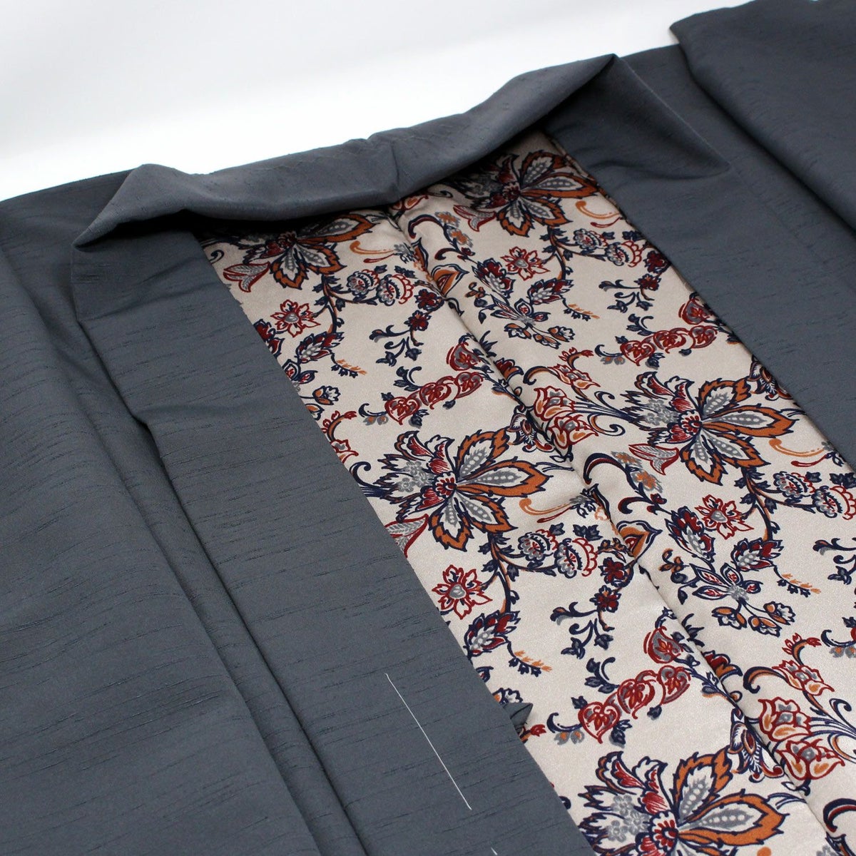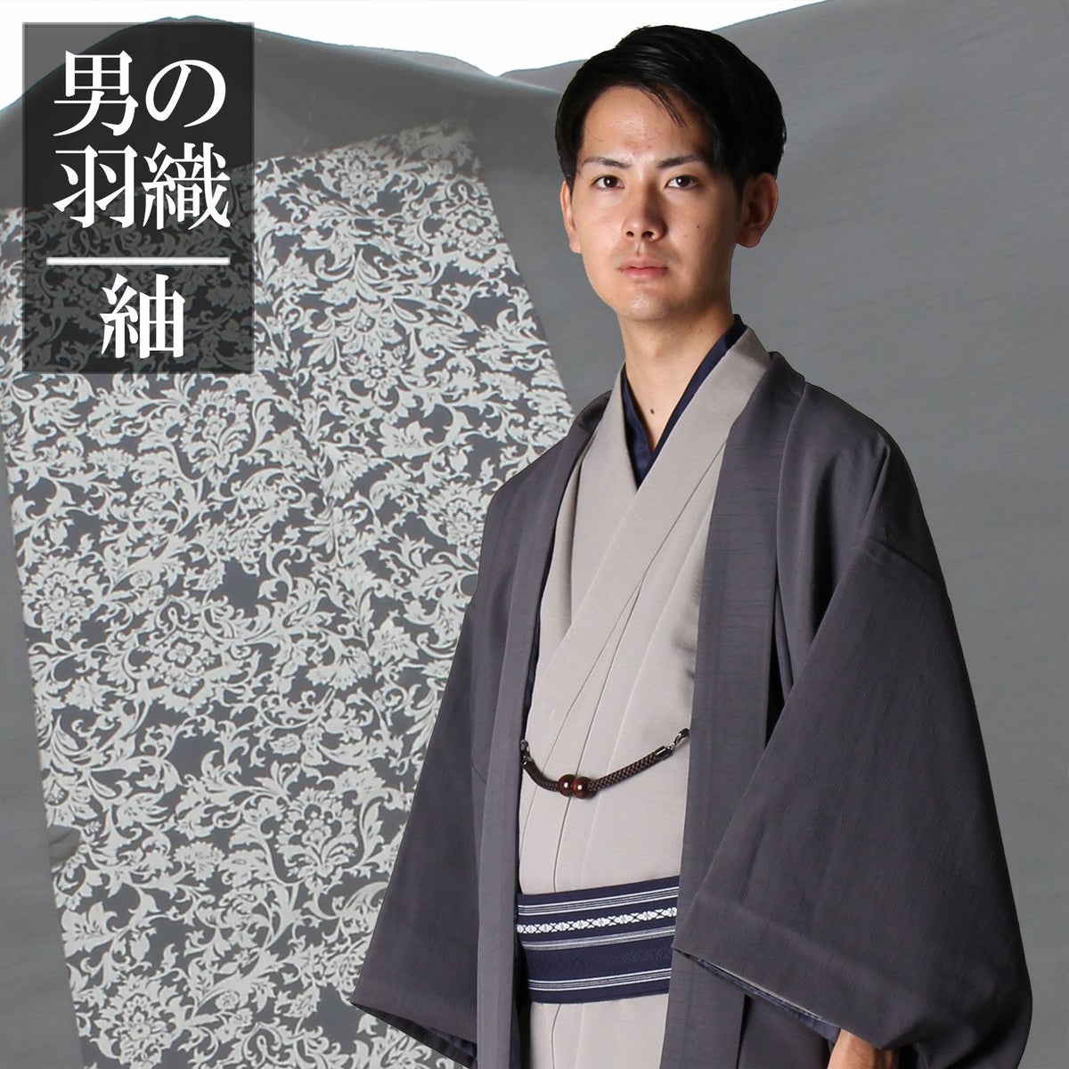 男羽織 洗える 袷 紬無地 濃グレー 花柄(7648)