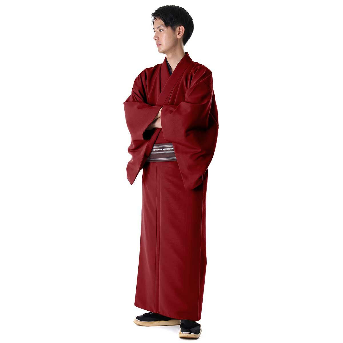 すぐに着られる男着物 洗える 紬 袷 濃赤色 175cm前後対応※裄(腕長さ)が短め