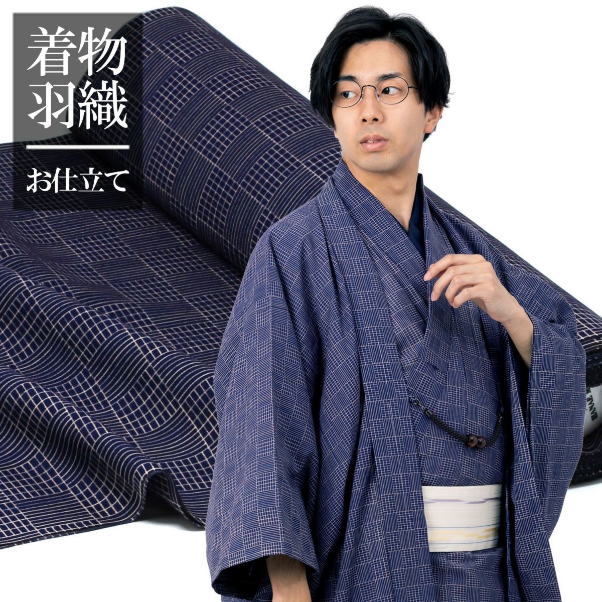 仕立てオーダー着物(もしくは羽織) 洗える着物 小紋 ハナエモリ 十字絣風 黒×青 (7774)